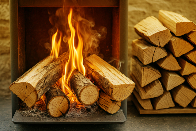La madera dura, como haya, roble o fresno, es ideal: arde de forma constante, ofrece un calor prolongado y deja pocos residuos en el conducto.