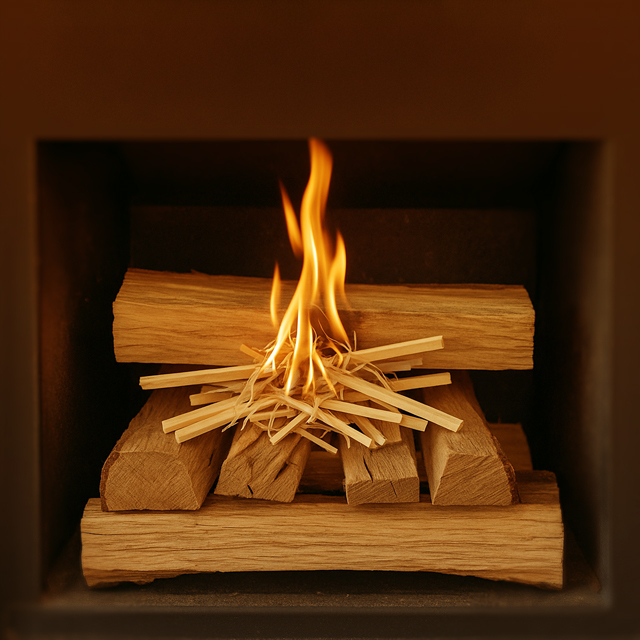 En lugar de colocar los troncos grandes abajo y las astillas arriba, se hace al revés: se apila la leña con los troncos grandes en la base y las astillas encima, y se enciende desde arriba. Las llamas van descendiendo poco a poco mientras el material superior calienta rápidamente la cámara de combustión.